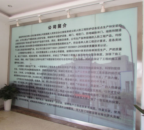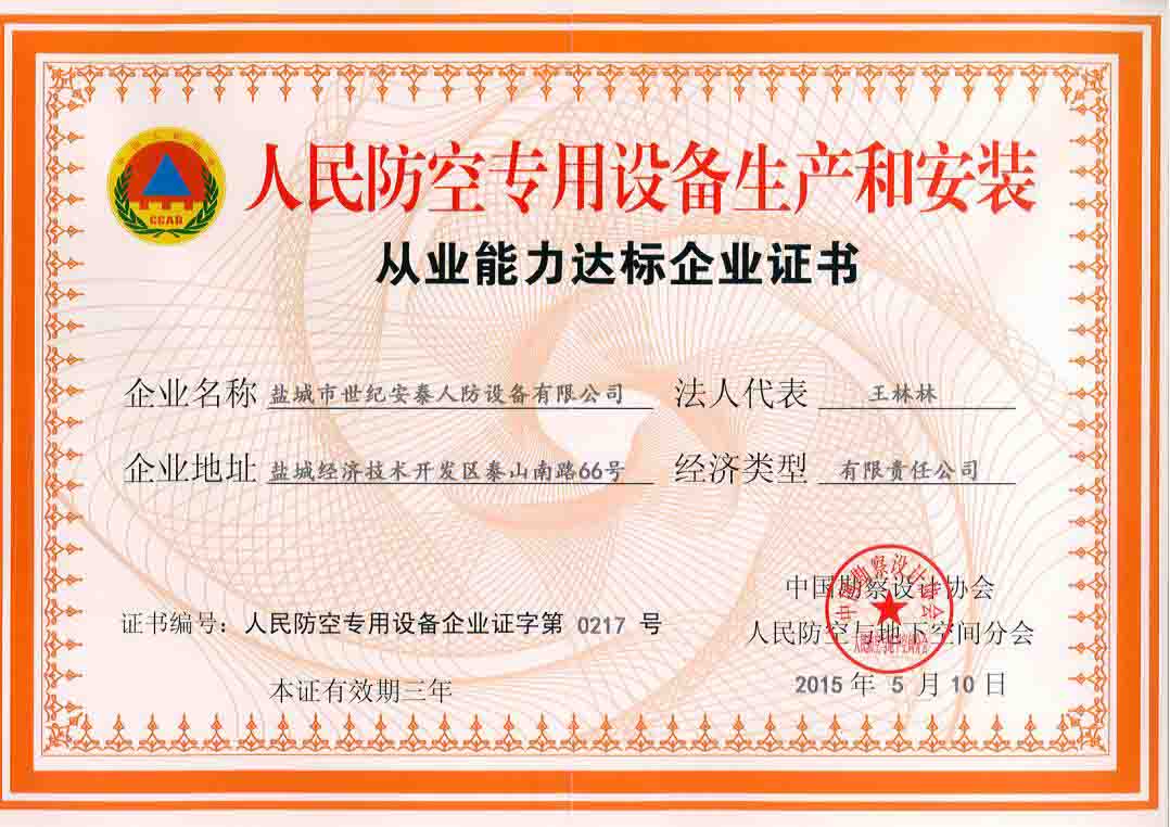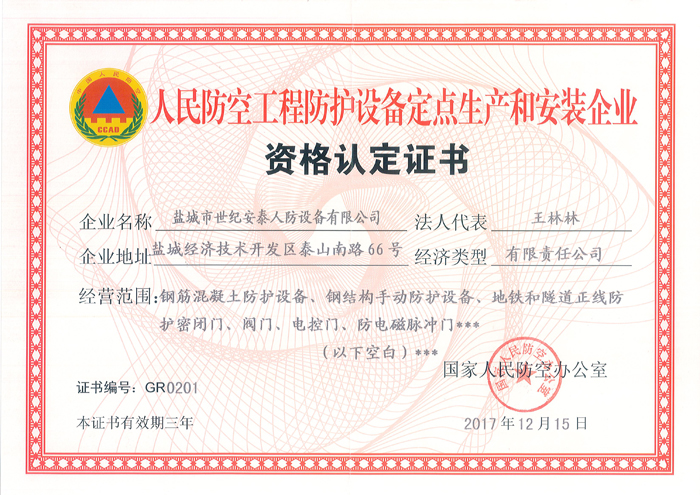鹽城市世紀(jì)安泰人防設(shè)備有限公司是國家人民防空辦公室批準(zhǔn)成立的人防工程防護(hù)設(shè)備定點生產(chǎn)和安裝企業(yè),是專業(yè)生產(chǎn)、銷售、安裝人防防護(hù)設(shè)備產(chǎn)品的企業(yè),公司主要生產(chǎn)鋼筋混凝土防護(hù)設(shè)備、鋼結(jié)構(gòu)手動防護(hù)設(shè)備、閥門、電控門、防電磁脈沖門、地鐵和隧道正線防護(hù)密閉門等各類產(chǎn)品并對產(chǎn)品進(jìn)行安裝、調(diào)試、維修及保養(yǎng),公司生產(chǎn)的各種規(guī)格的人防工程產(chǎn)品,均按國家人防總參工程兵四所及中國建筑標(biāo)準(zhǔn)設(shè)計研究院提供的圖紙生產(chǎn),符合各種人防工程設(shè)計要求,是各類地下人防工程選用的理想產(chǎn)品。本公司已通過GB/T19001-2008IDT ISO9001:2008國家質(zhì)量體系認(rèn)證。